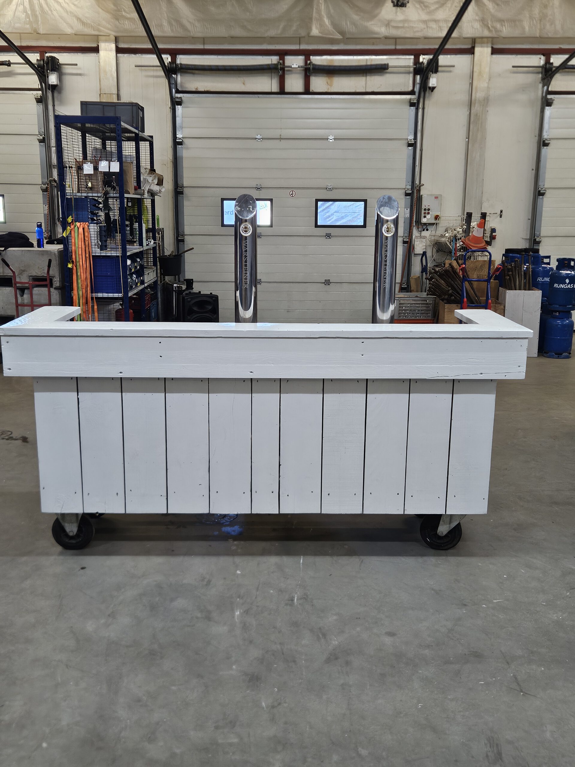 Mobiele bar met 2 tappunten waardoor 2 verschillende soorten bier kan worden aangesloten, tapvermogen 50 liter per uur. Afmeting is 226 cm lang en 68 cm breed